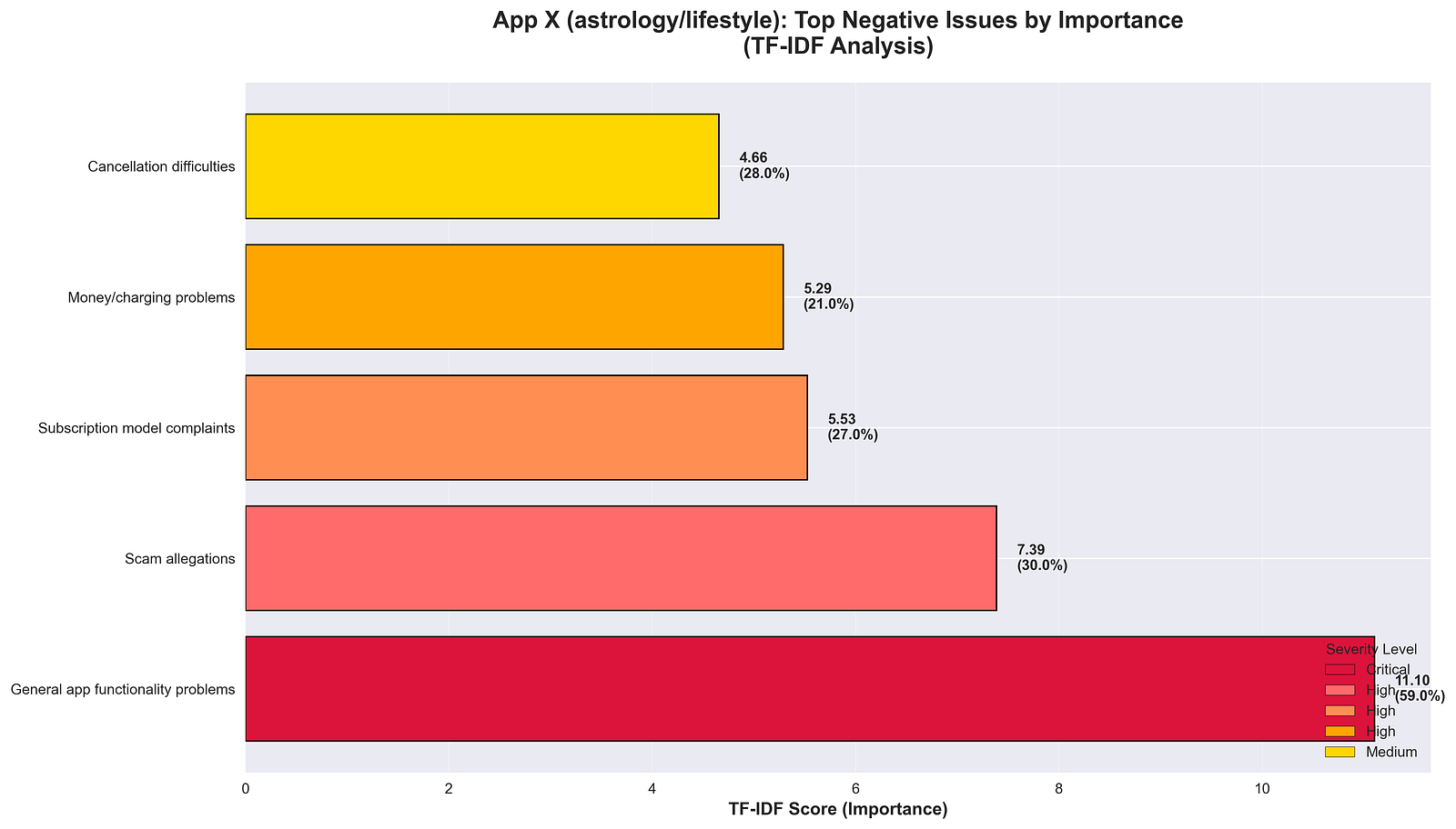 Horizontal bar chart ranking the five main negative issues for App X by TF-IDF importance: functionality problems, scam allegations, subscription model complaints, billing issues, and cancellation difficulties.