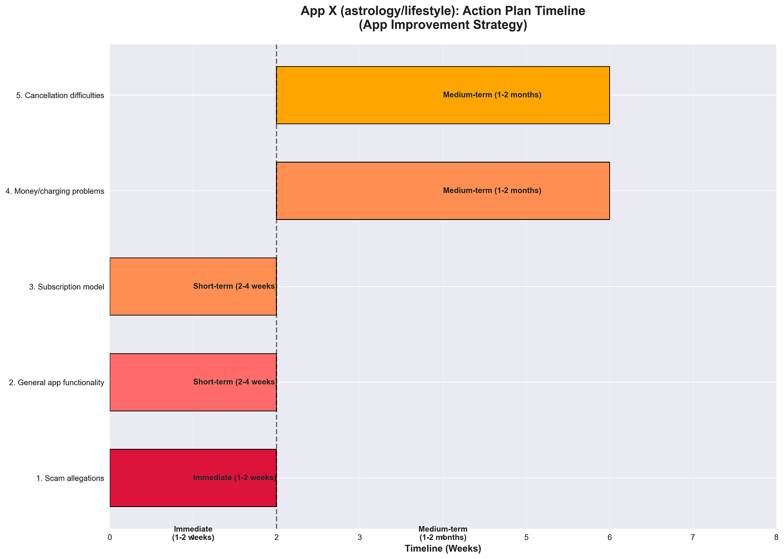 Horizontal timeline chart showing prioritized fixes for App X: scam allegations as immediate (1–2 weeks), functionality and subscription improvements short-term (2–4 weeks), billing and cancellation fixes medium-term (1–2 months).