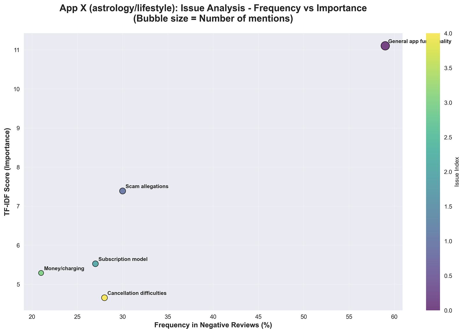 Each issue’s frequency and TF-IDF importance align closely, confirming the prioritization. “Functionality” and “Scam” dominate both axes, signaling where attention should go first.
