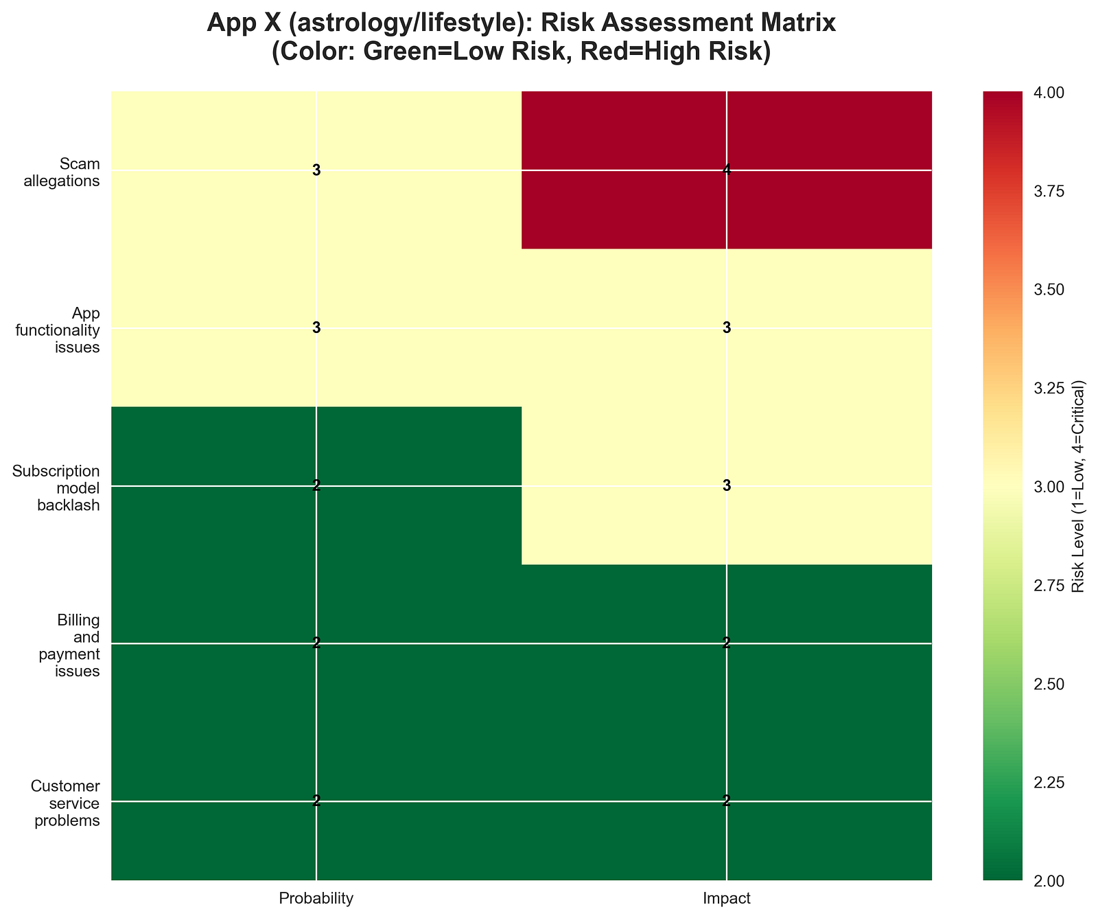 A heatmap of probability vs impact shows only two red zones — scam allegations (critical trust risk) and functionality issues (core experience risk). Others fall in the medium or low range, suitable for gradual optimization.