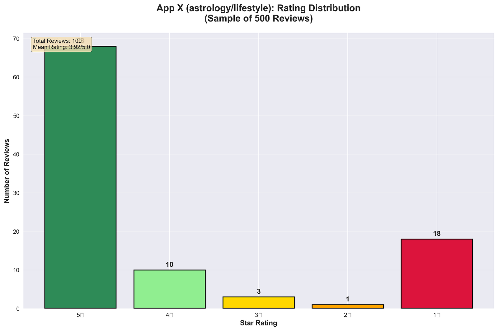 Perhaps most importantly, star ratings alone can be misleading. An app might maintain a high 4.5★ average rating overall, yet hide a pocket of serious discontent in recent reviews. By digging into textual feedback, we uncover nuances that star averages mask. In the case study below, App X (astrology/lifestyle)’s official rating is quite high, but our analysis exposed clear friction points that warranted attention. This underscores why a dedicated review analysis system matters for any data-driven product strategy.