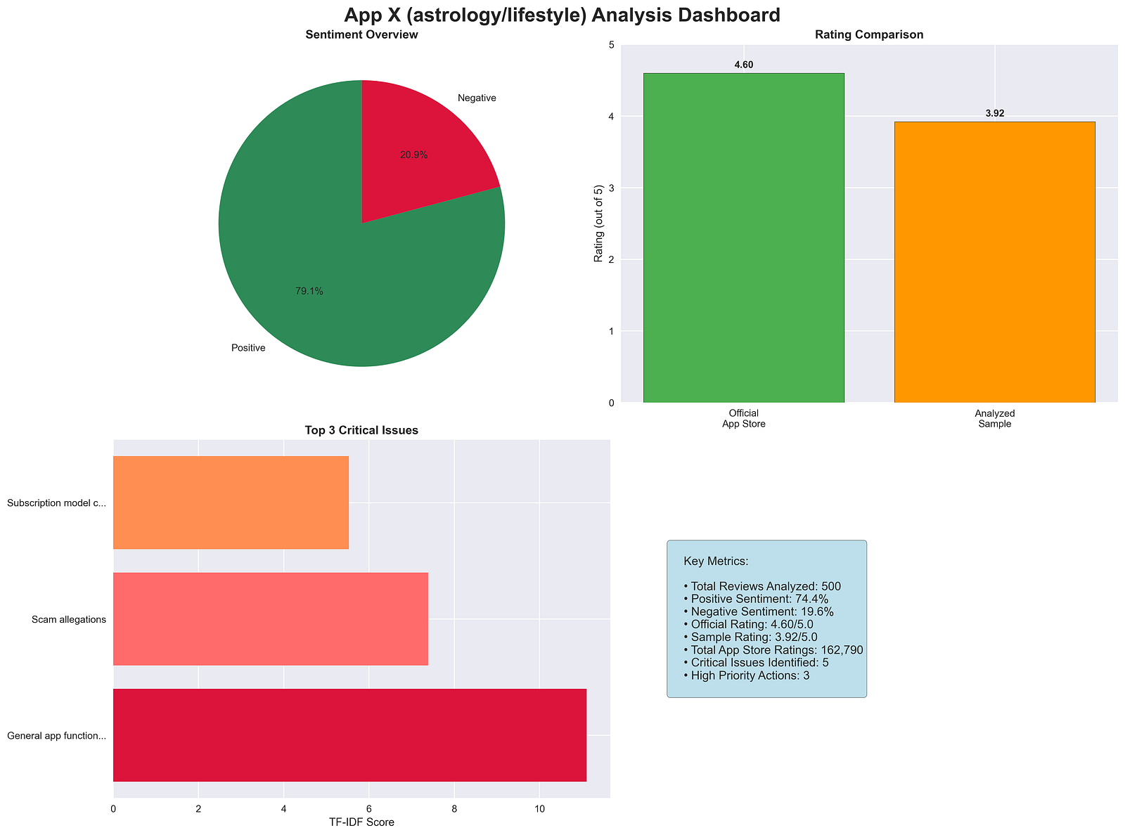 Below are key charts from the App X (astrology/lifestyle) review analysis (≈500 reviews) showing sentiment, rating distribution, and top issues.