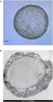 Figure 1 Neural organoid in vitro. (A) Bright-field image showing the spherical  structure of a neural organoid. (B) Transmission electron microscopy image  illustrating cellular organization and peripheral layering. Scale bar = 10 μm.