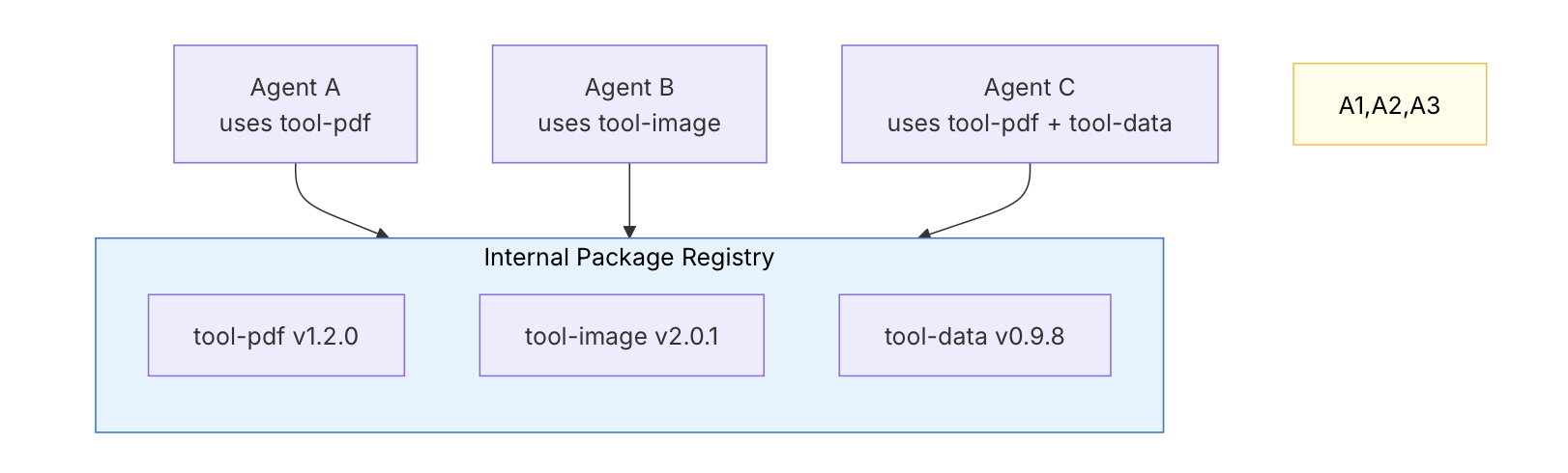 Вместо бесконечного копирования можно вынести тулзы в отдельные доменные пакеты, например pdf-toolset, image-processing, data-analysis, и подключать их к агентам через корпоративный пакетный менеджер — по тому же принципу, как это делают разработчики с npm или PyPI.
