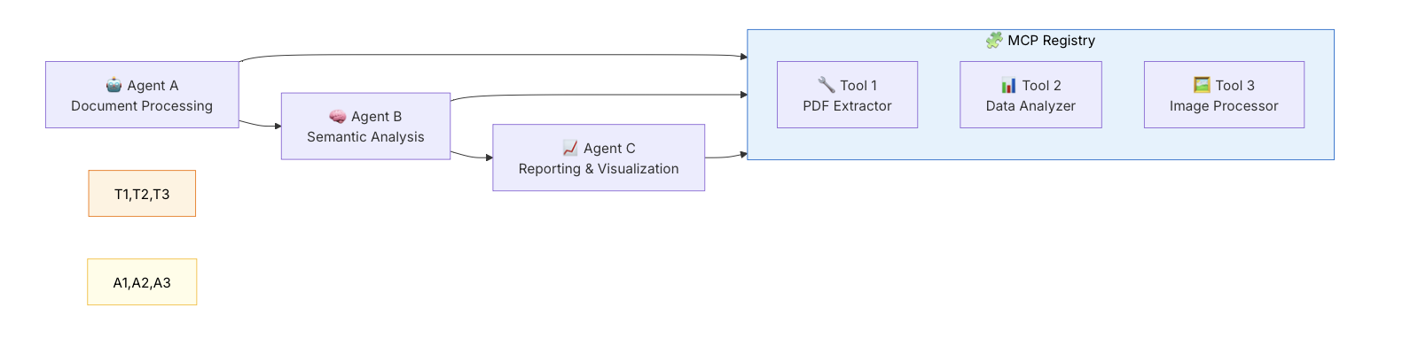 Например, агент, отвечающий за анализ PDF-документов, может через MCP вызвать инструмент для извлечения текста, передать результат агенту, занимающемуся семантическим анализом, и далее агенту, который создаёт визуализацию — всё без ручных связей между модулями и без вмешательства разработчика.